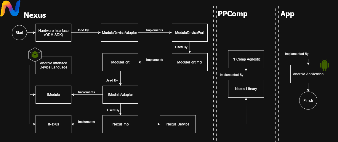 NexusService – Main Android service responsible for hosting the Nexus AIDL interface and managing the lifecycle of all terminal operations. This service acts as the central entry point for client applications, exposing EMV, contact, contactless, MSR, system, cryptographic, and table operations through IPC, while coordinating access to hardware resources and underlying kernels.